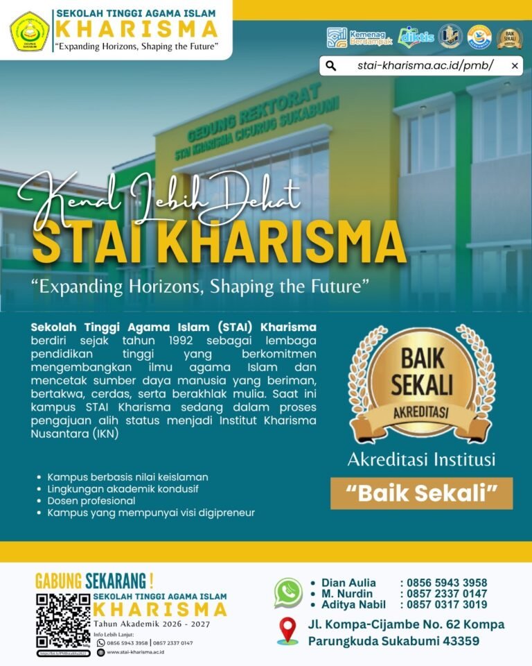 Menjadi bagian dari STAI Kharisma Cicurug Sukabumi adalah pengalaman yang luar biasa. Di sini, saya mendapatkan bimbingan akademik yang tidak hanya mendalam, tetapi juga menyeluruh. Dosen-dosennya sangat kompeten dan selalu siap membantu kami untuk mencapai potensi terbaik. Selain itu, fasilitas yang disediakan sangat mendukung kegiatan belajar mengajar, mulai dari perpustakaan yang lengkap hingga laboratorium komputer yang modern. Saya merasa sangat bangga dan bersyukur bisa menimba ilmu di STAI Kharisma ini. Semoga kampus ini terus maju dan berkembang, mencetak generasi penerus yang unggul dan berakhlak mulia.